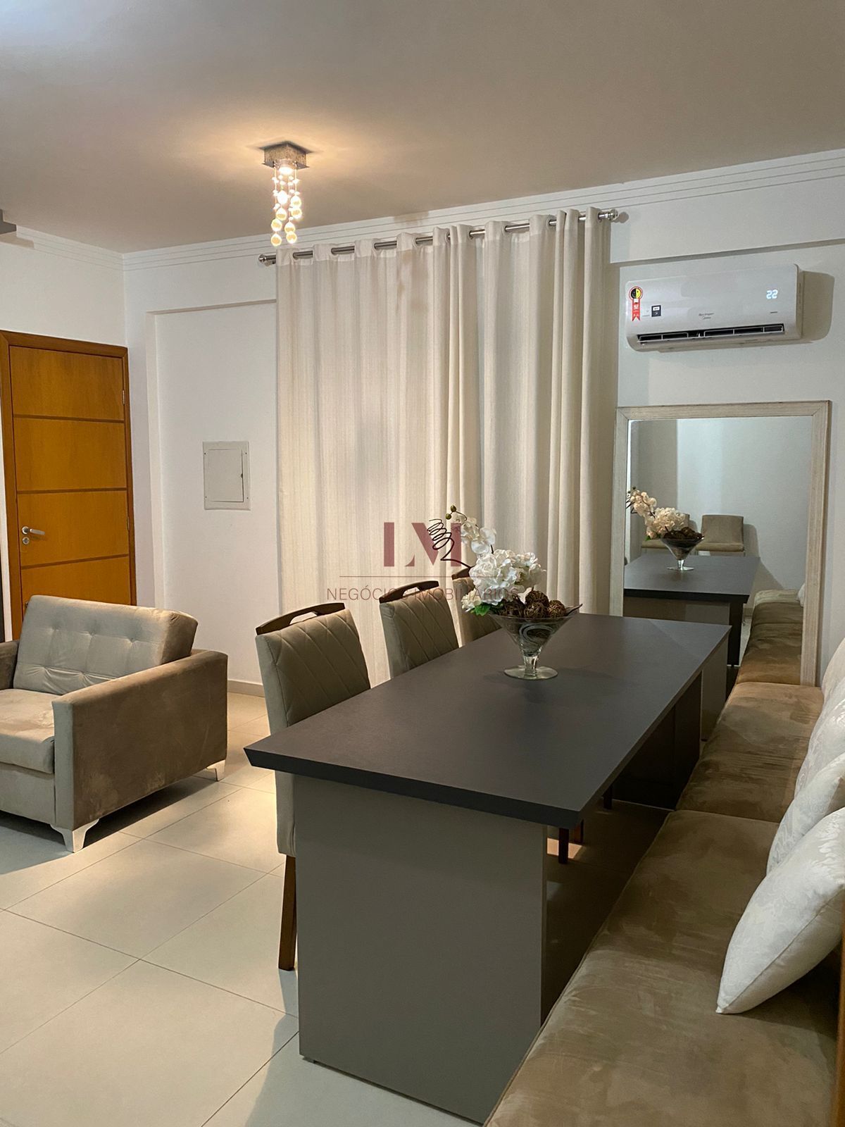 Sala em 2 ambientes com sacada e painel em toda parede