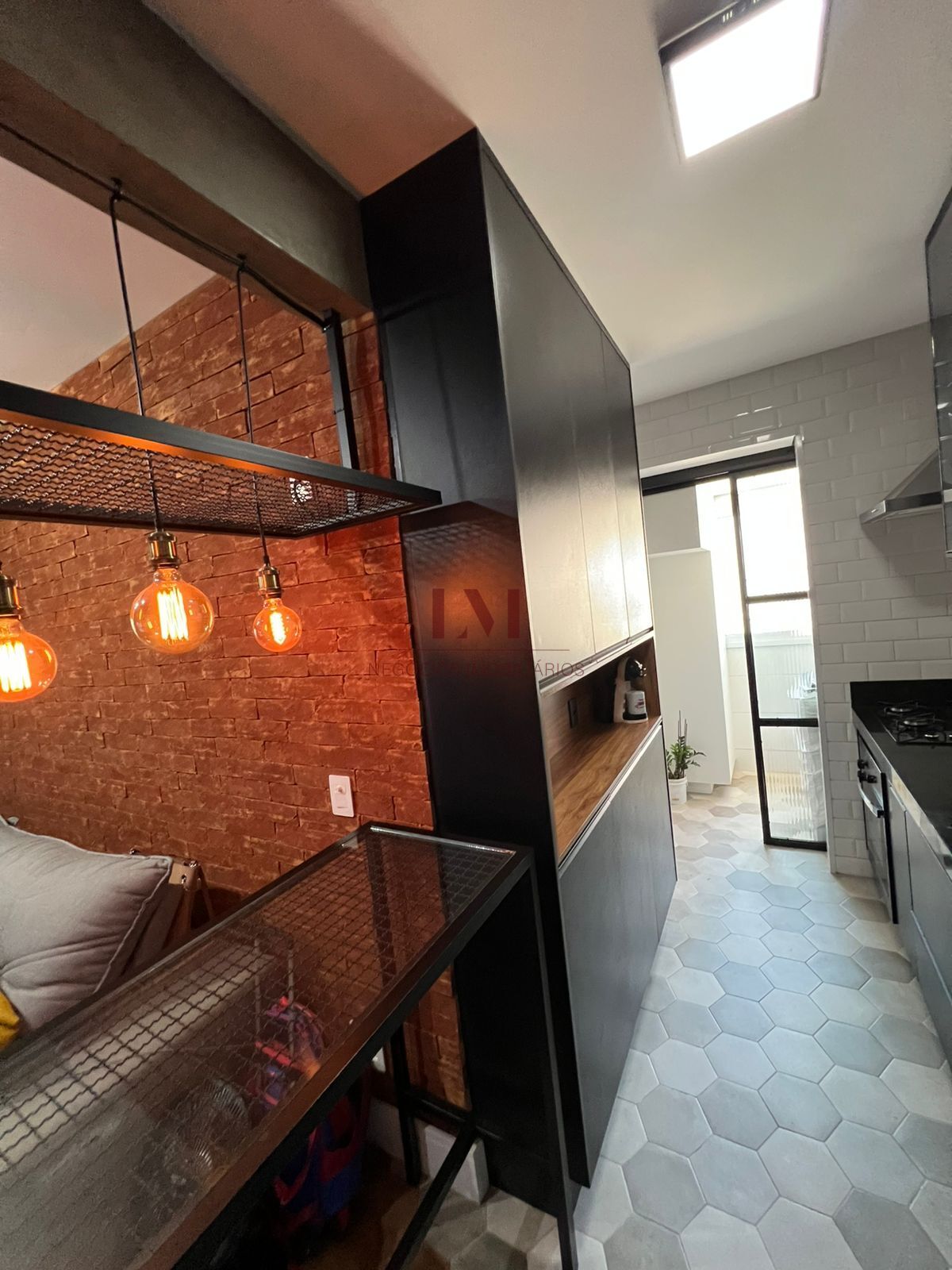 -Sala conjugada e cozinha completa com armários, forno, cooktop e coifa