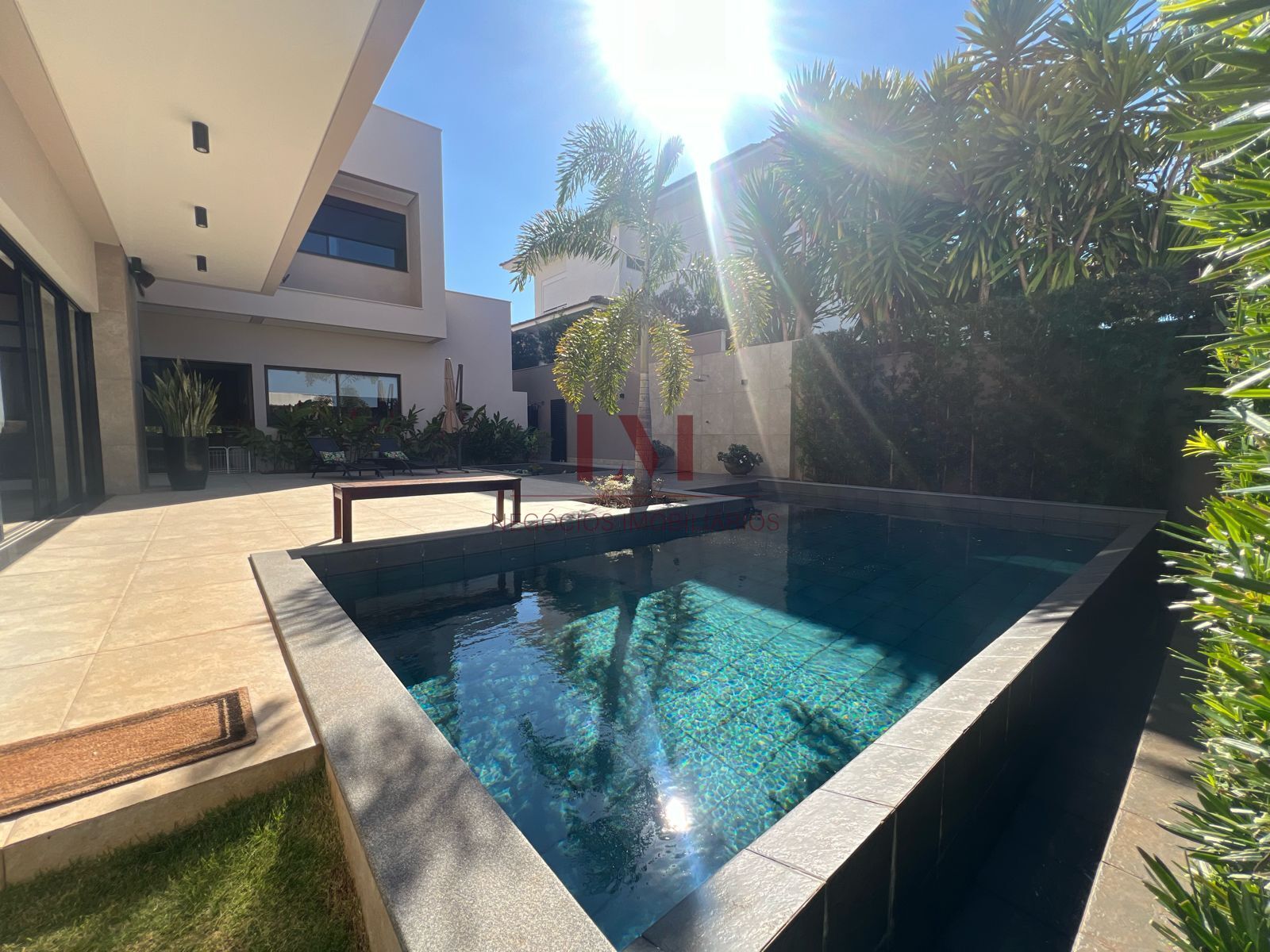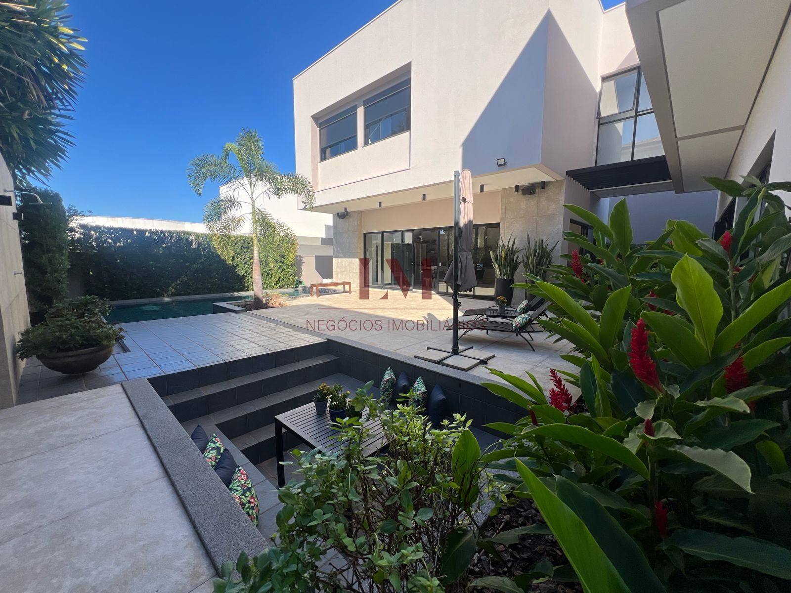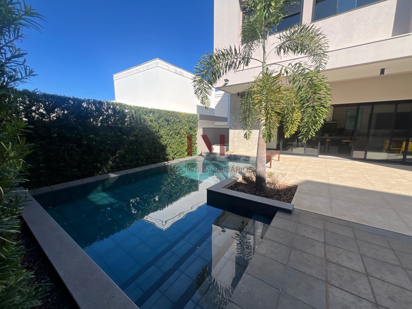Piso inferior: sala pé direito duplo com 7 metros mármore bege Bahia, sala de tv integrada com sala de estar, cozinha montada, triturador na cozinha e área gourmet, área serviço separada com banheiro, área gourmet toda mobiliada e decorada com freezer cervejeira, som integrado, piscina com borda infinita, lareira ao ar livre