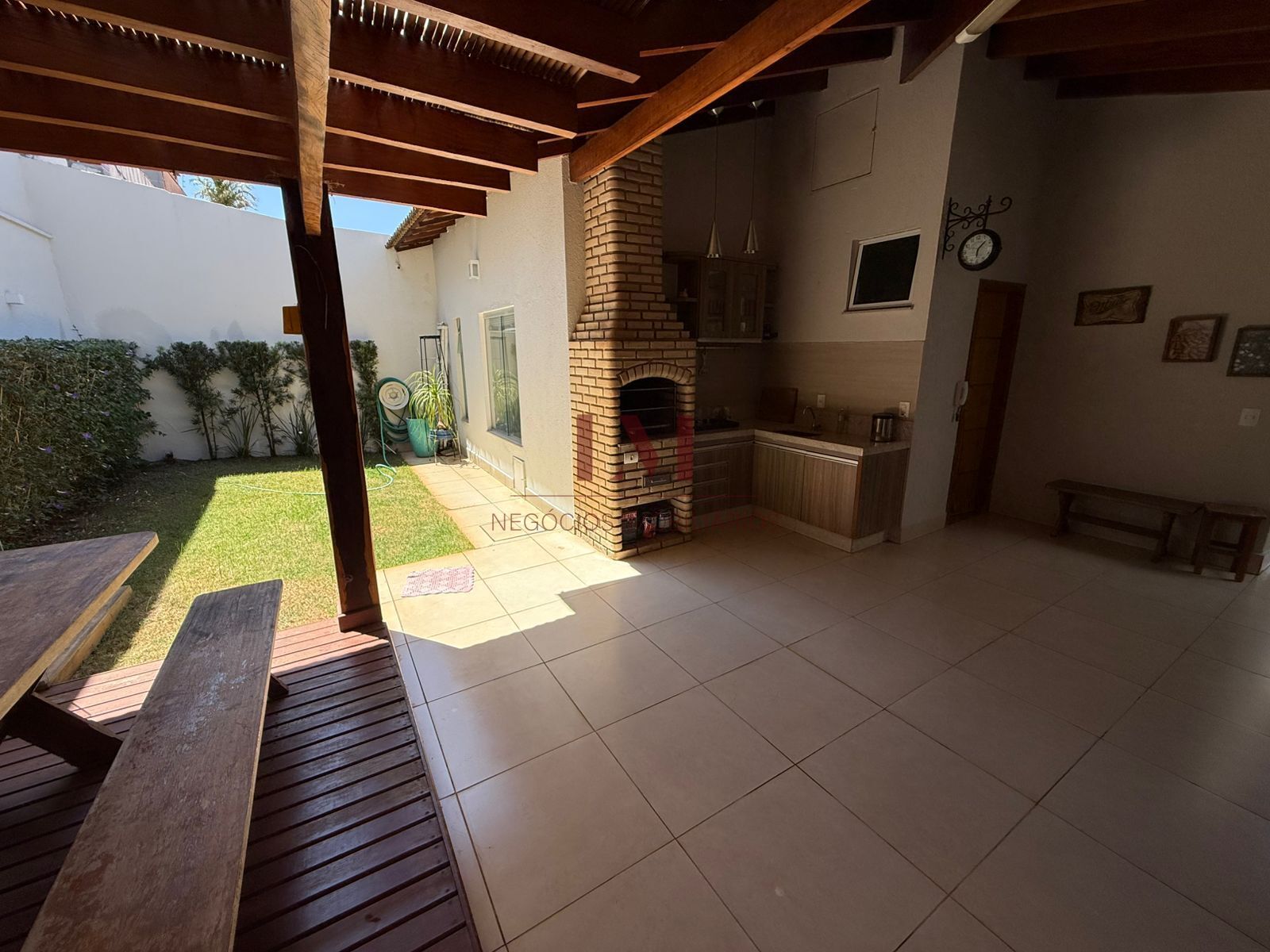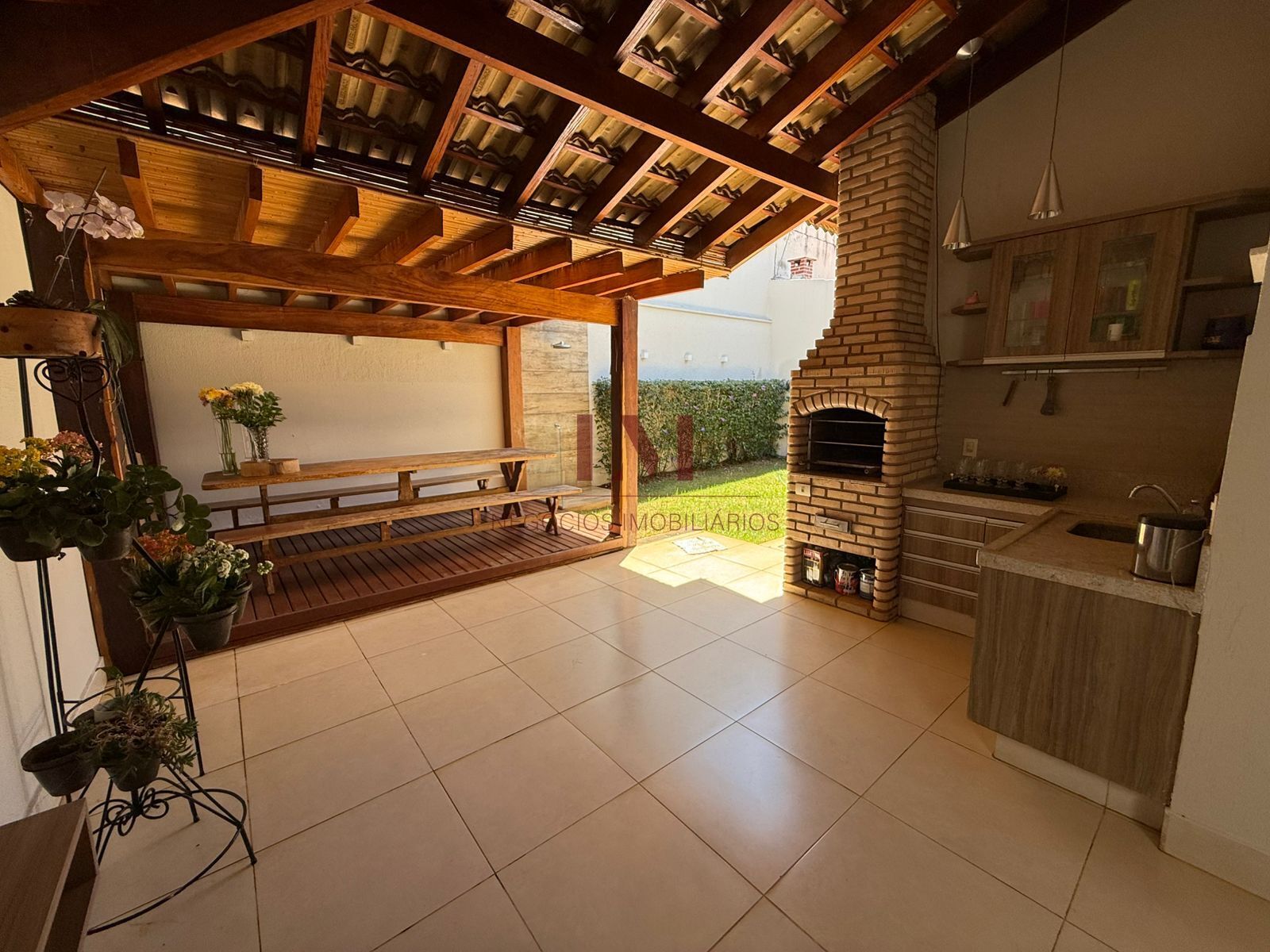 -Varanda gourmet com churrasqueira, lavabo, ducha, painel, hack e jardim.