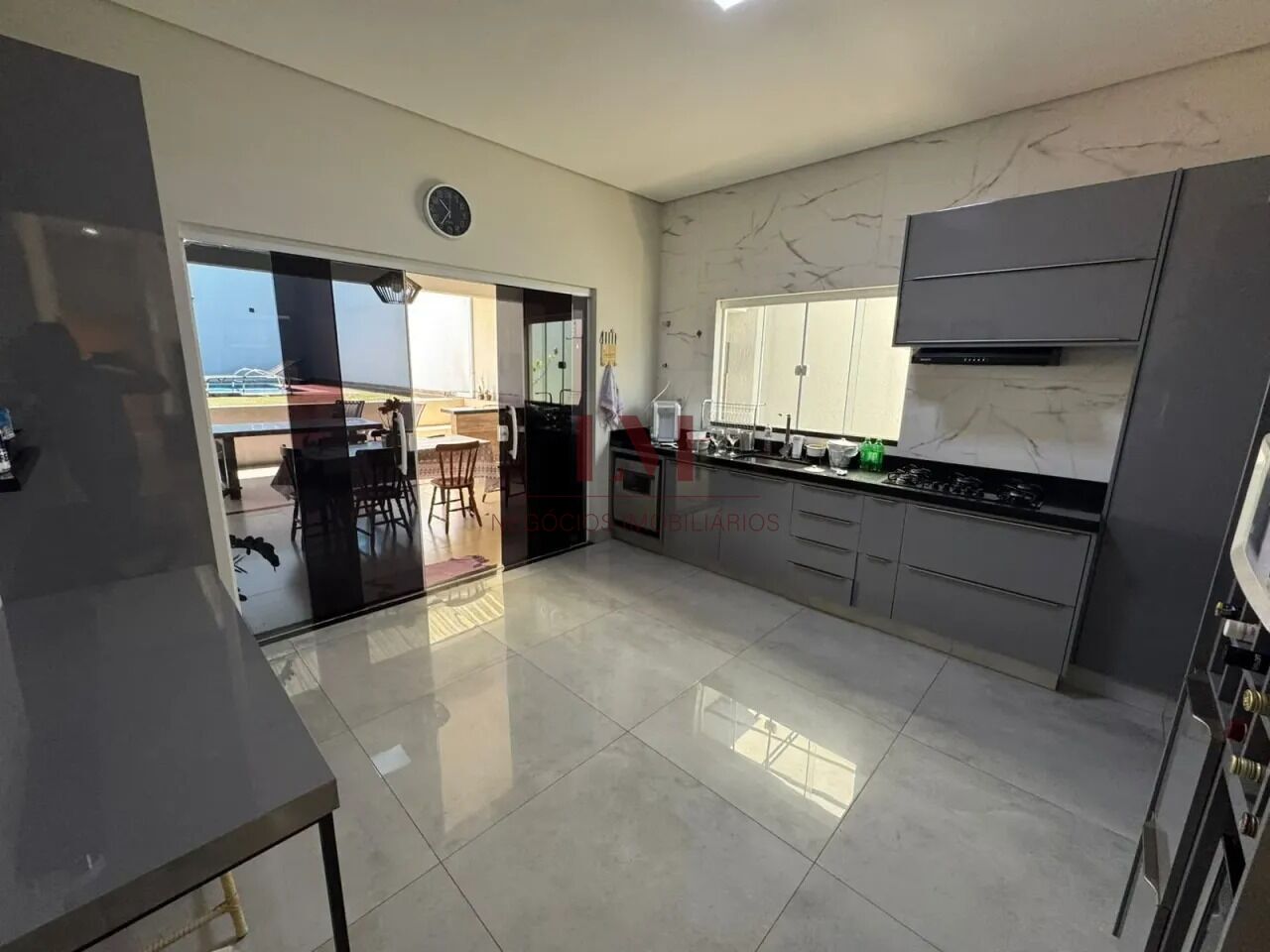 -Cozinha com planejados, cooktop, exaustor, forno elétrico, lava louças e mesa de apoio, despensa com prateleiras